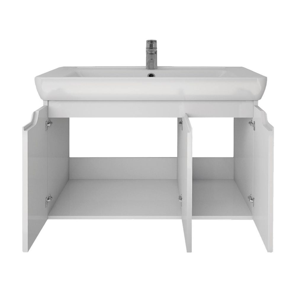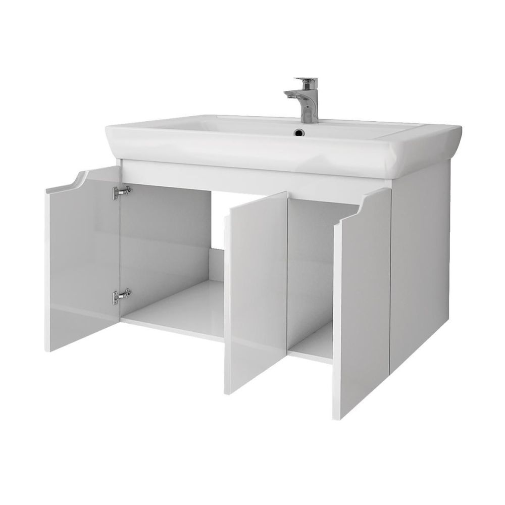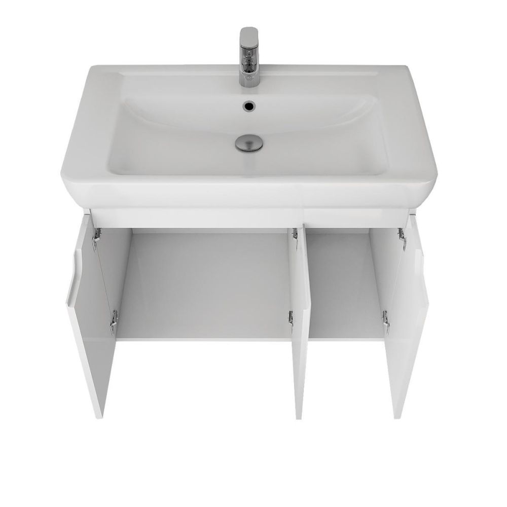 Тумба под раковину подвесная Dreja Q(D) 80 см, белый. Фурнитура: Hettich. Компоновка: 3 дверцы, 2 полки. Монтаж: подвесной. Раковина арт.: 192185 в комплекте.