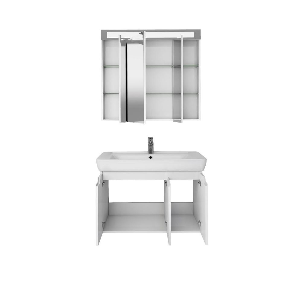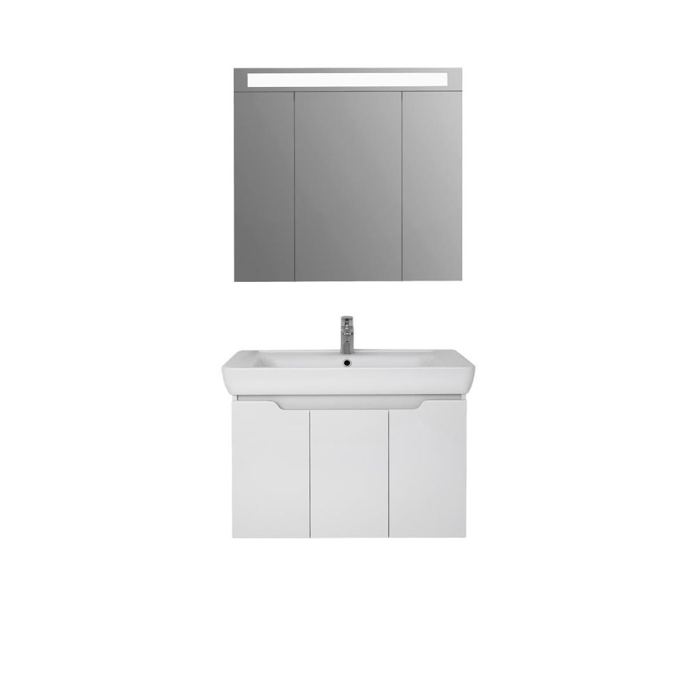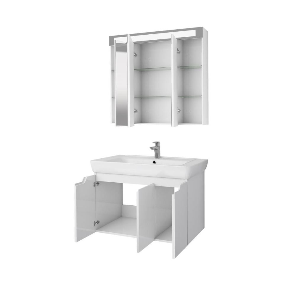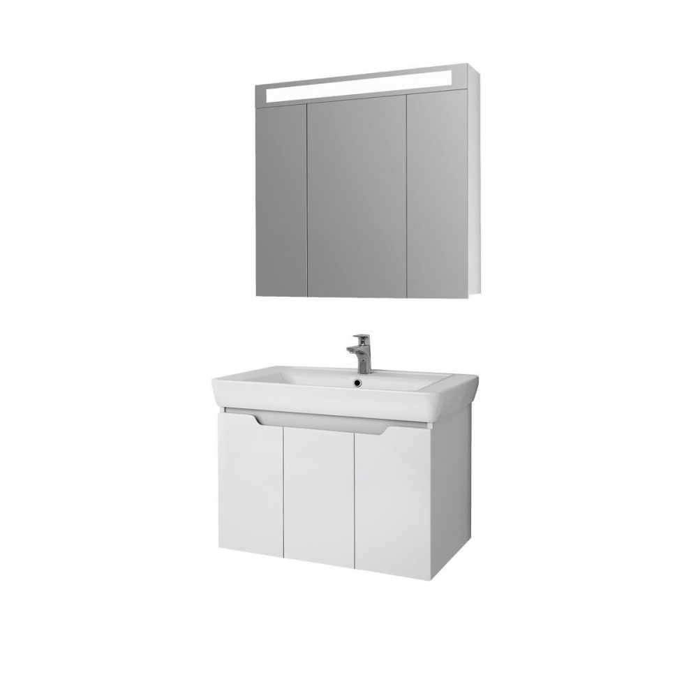 Тумба под раковину подвесная Dreja Q(D) 80 см, белый. Фурнитура: Hettich. Компоновка: 3 дверцы, 2 полки. Монтаж: подвесной. Раковина арт.: 192185 в комплекте.