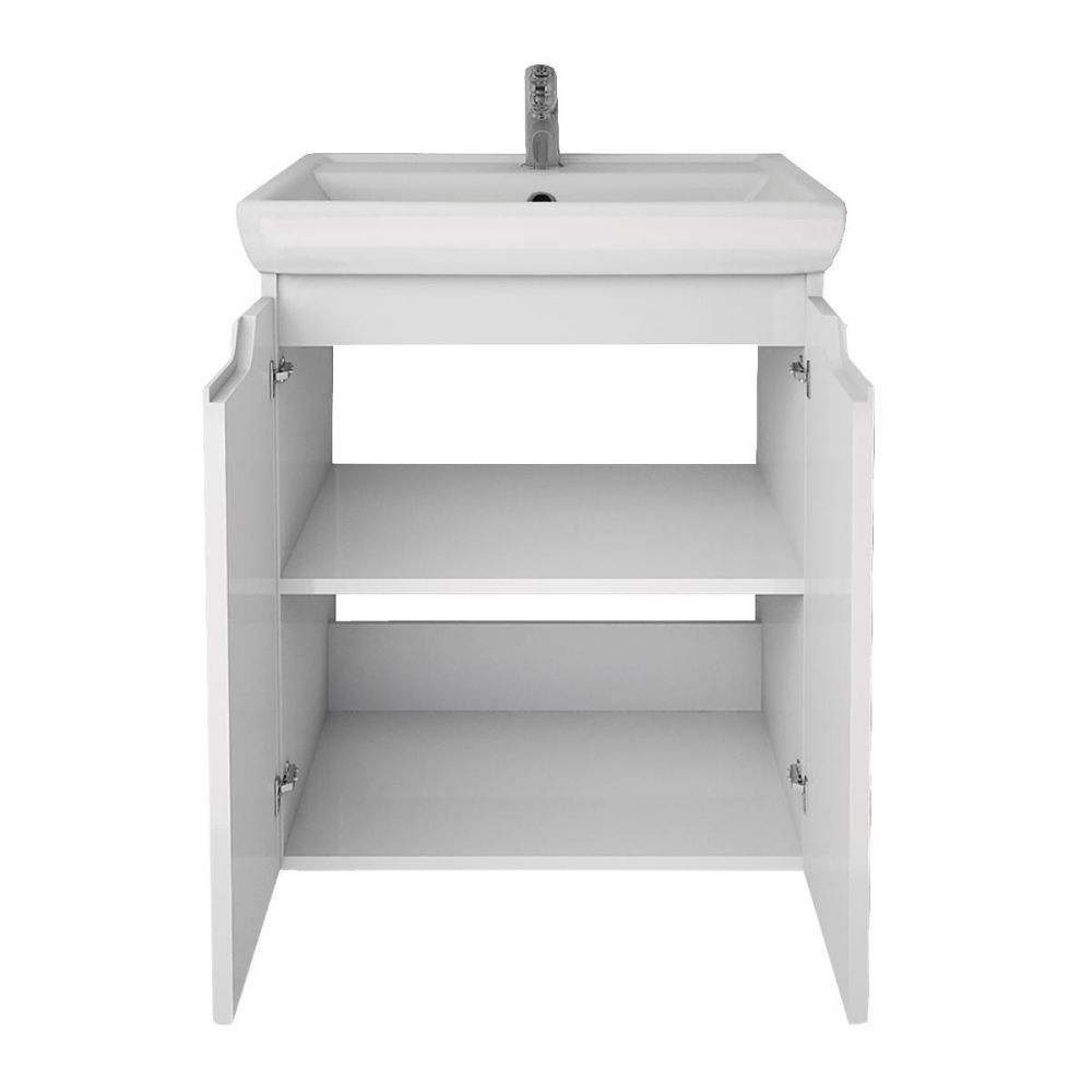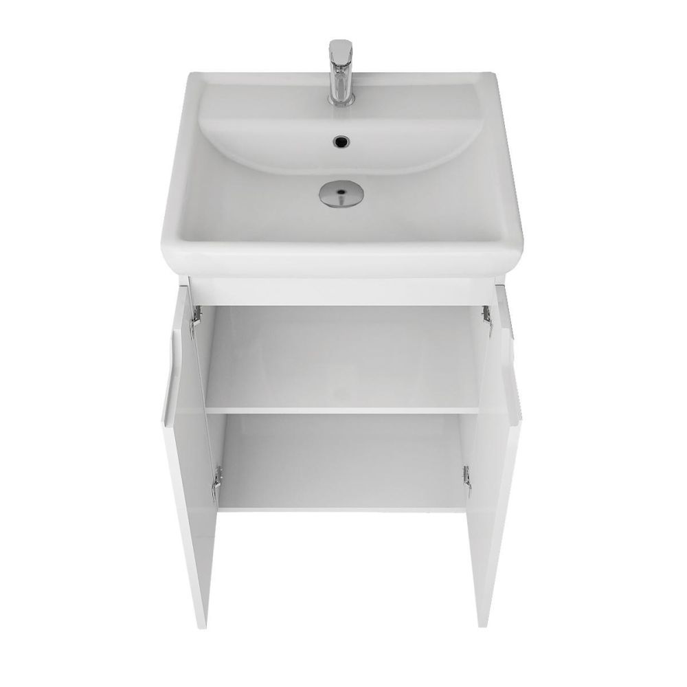 Тумба под раковину подвесная Dreja Q Plus (D) 55 см, белый. Фурнитура: Hettich. Компоновка: 2 дверцы, 1 полка. Монтаж: подвесной/напольный. Для монтажа необходимо закрепить тумбу к стене и использовать входящие в комплект поставки опоры. Раковина арт.: 195476 в комплекте.