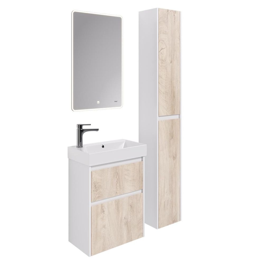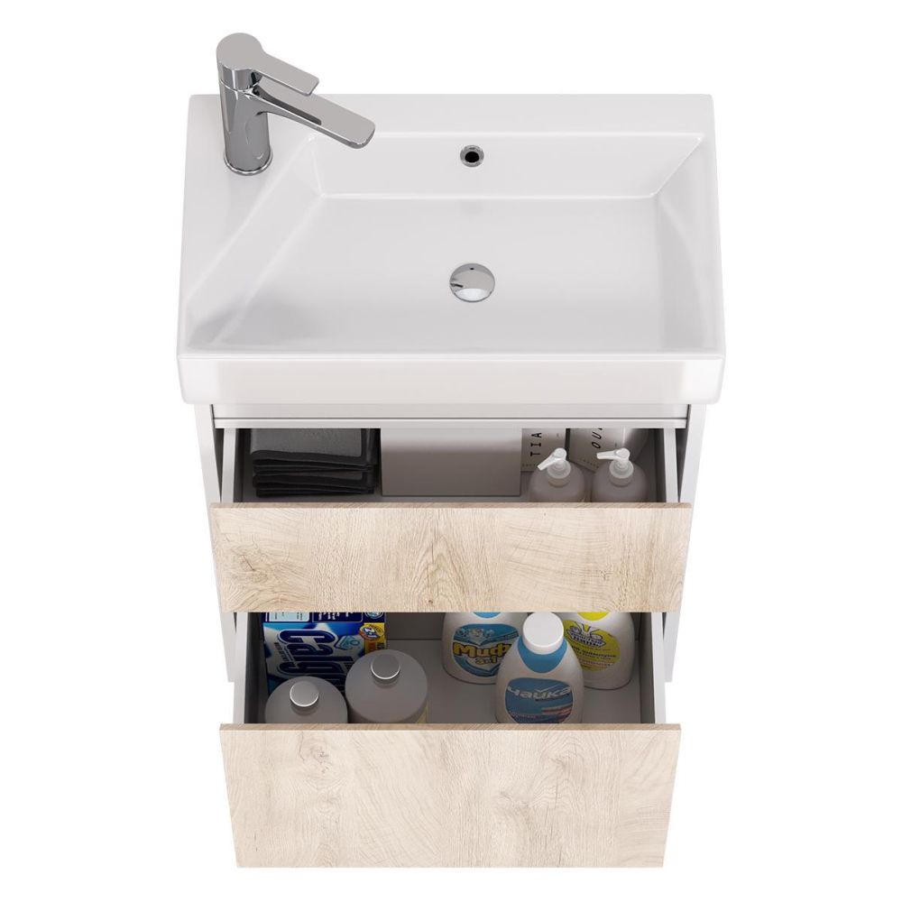 Тумба под раковину подвесная Dreja Slim 55 см, белый/дуб кантри. Фурнитура: Boyard. Компоновка: 2 ящика. Монтаж: подвесной/напольный. Раковина арт.: 17055-KL в комплекте.