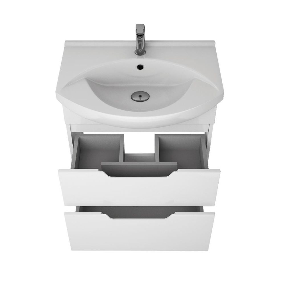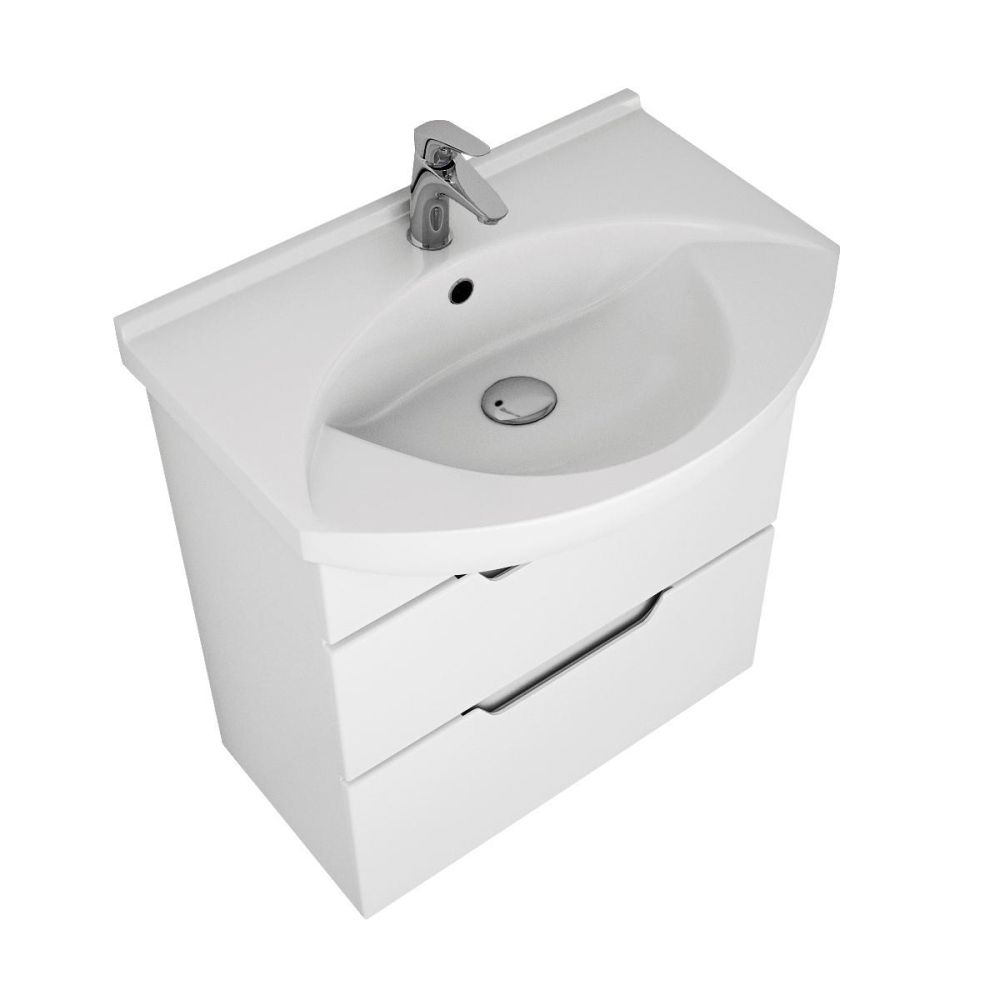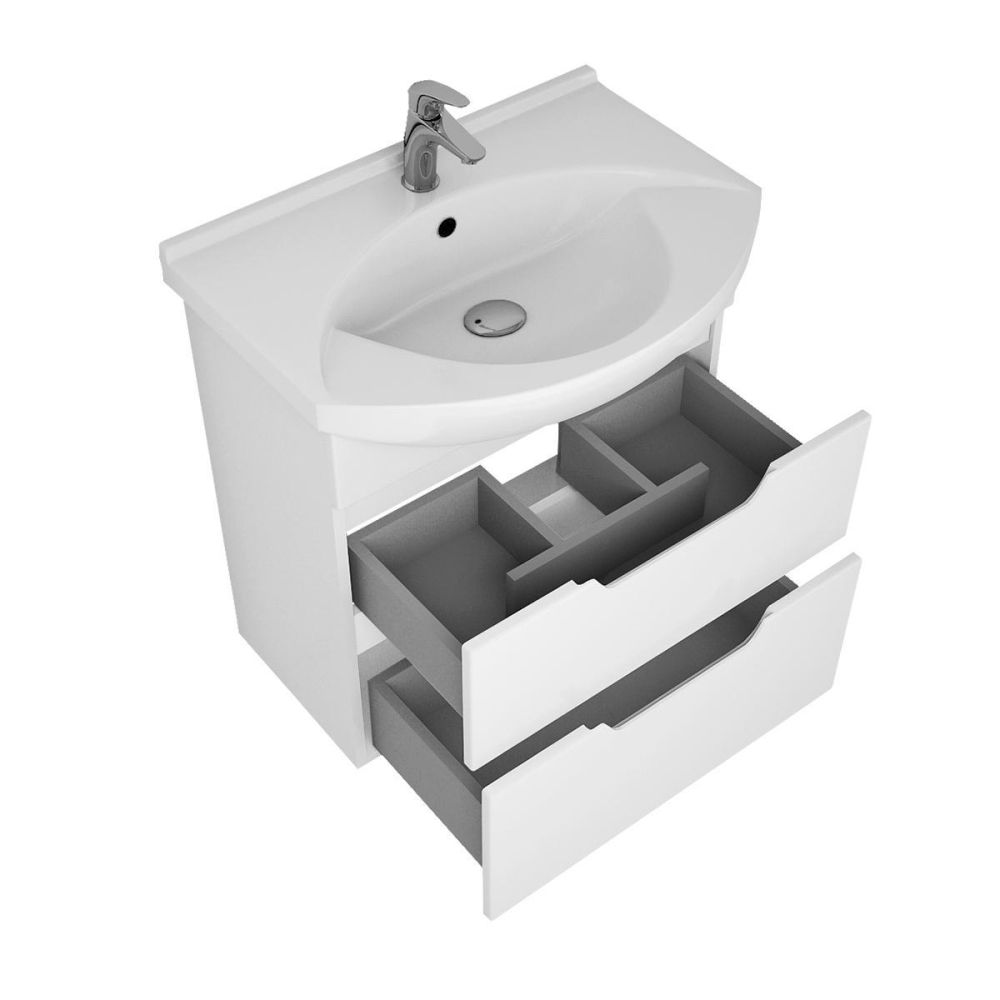 Тумба под раковину подвесная/напольная Dreja Laguna Plus 75 см, белый. Фурнитура: Hettich. Компоновка: 2 ящика. Дополнительные функции: встроенный органайзер в верхнем ящике. Монтаж: подвесной/напольный. Для монтажа необходимо закрепить тумбу к стене и использовать входящие в комплект поставки опоры. Раковина арт.: 28230 в комплекте.