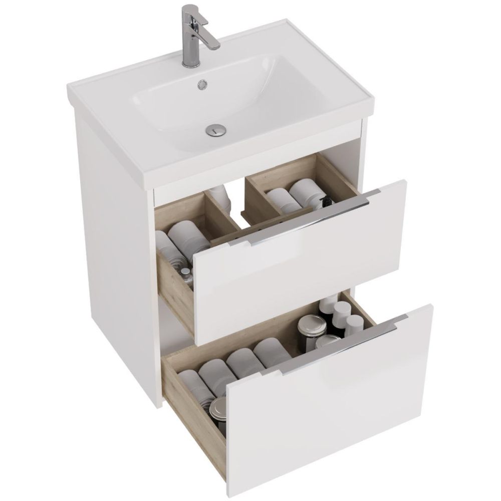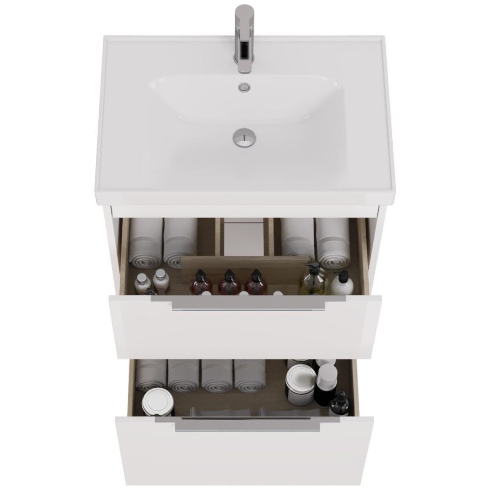 Тумба под раковину подвесная/напольная Dreja Prime 70 см, белый. Фурнитура: Hettich. Компоновка: 2 ящика. Дополнительные функции: встроенный органайзер в верхнем ящике. Монтаж: подвесной/напольный. Возможен напольный монтаж - необходимо отдельно приобрести ножки Dreja арт.: 99.9811 Раковина арт.: 641600 в комплекте.