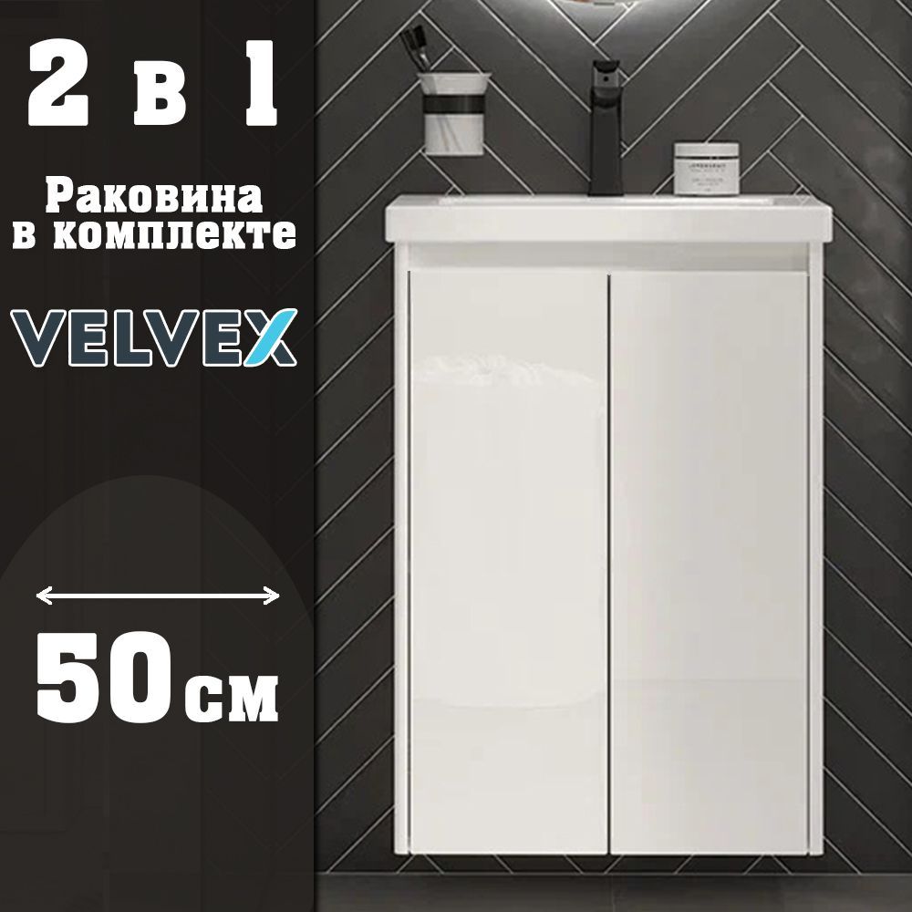 Тумба с раковиной подвесная Velvex Klaufs tp.KLA.COM.50.2D, 50 см: 2 распашные дверцы,1 полка, выдвижной органайзер. Раковина в комплекте.