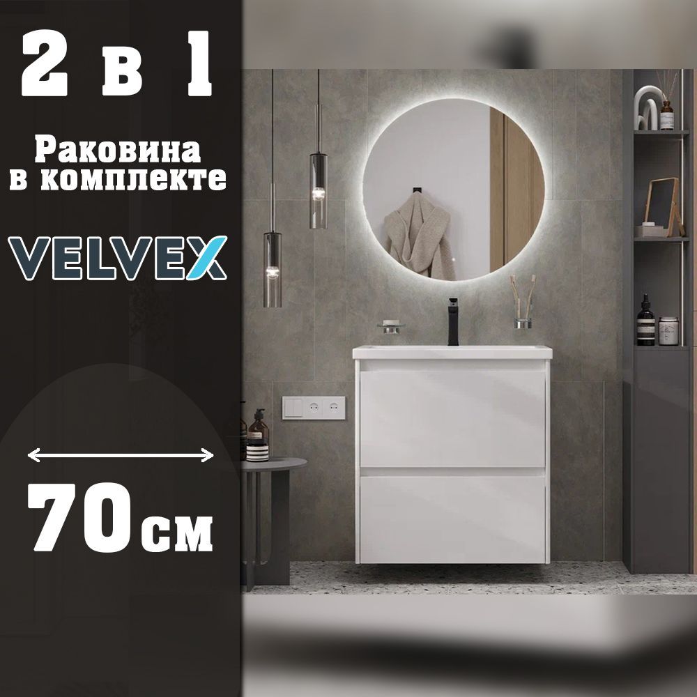 Тумба с раковиной подвесная Velvex Klaufs tp.KLA.COM.70.2Y, 70 см: 2 выдвижных ящика, выдвижной органайзер. Раковина в комплекте.