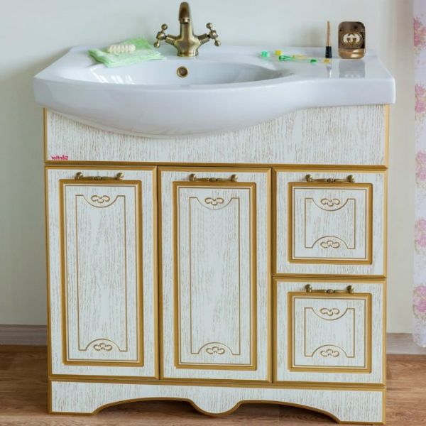 Напольная тумба Sanflor Адель 82 R Н0000001074 белого цвета с золотым патинированием, с двумя распашными дверцами и двумя выдвижными ящиками, для использования в ванных комнатах с повышенной влажностью. Технические характеристики: - Материал фасада: лакированный МДФ. - Материал корпуса: влагостойкая ЛДСП. - Поверхность: фактура. - Цвет фурнитуры: бронза. - Ориентация: правая. Отделения: - Левое: две распашные дверцы, одна полка из ЛДСП; - Правое: два выдвижных ящика. В комплекте поставки: тумба.
