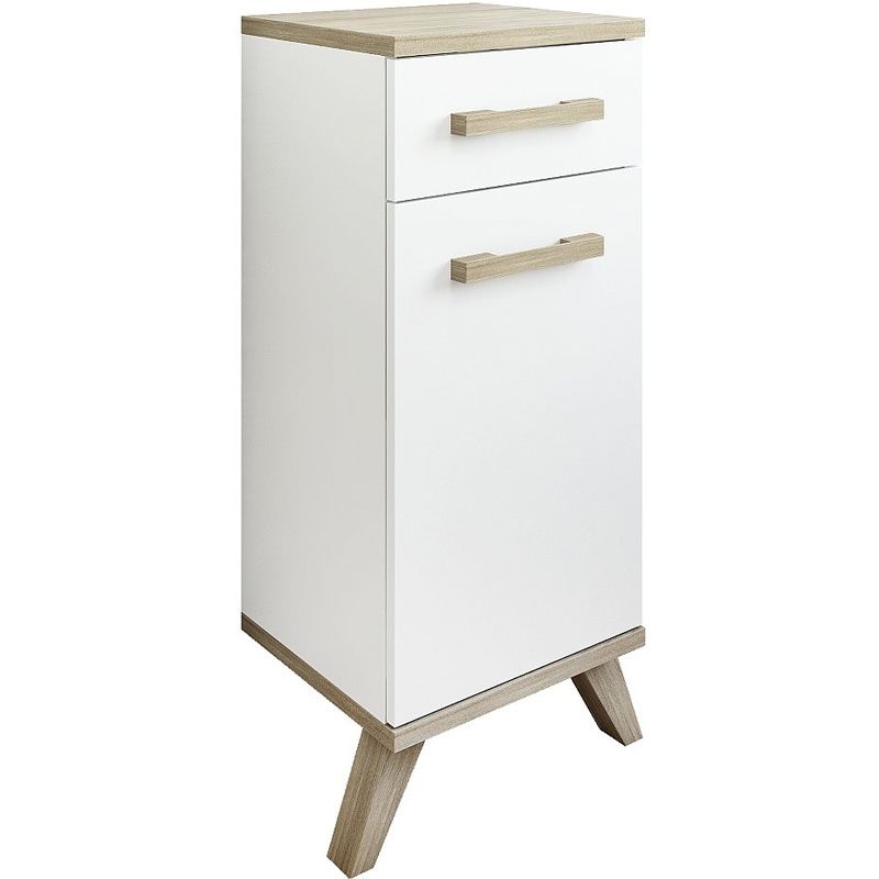 Тумба Sanflor Ингрид 30 С03689 напольная изготовлена из качественных материалов в современном элегантном стиле. Поможет в создании ультрамодной ванной комнаты с сохранением актуальной функциональности. Предназначена для использования в условиях повышенной влажности. - Цвет: белый/швейцарский вяз. - 1 выдвижной ящик, 1 распашная дверца. - Фасад и корпус тумбы выполнены из МДФ, ЛДСП. - Ручки деревянные. - Петли с механизмом плавного закрытия. - Установка напольная. В комплекте поставки: тумба, ножки (2 шт.).