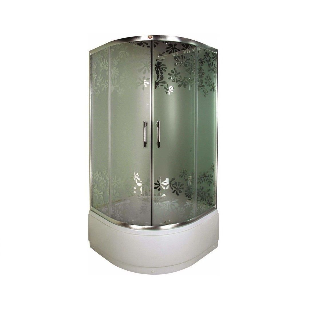 В модели красиво сочетается алюминиевый матовый профиль и матовое стекло с цветочным рисунком. Закругленная форма уголка экономит место в ванной комнате. При этом внутри душевой зоны достаточно комфортно.