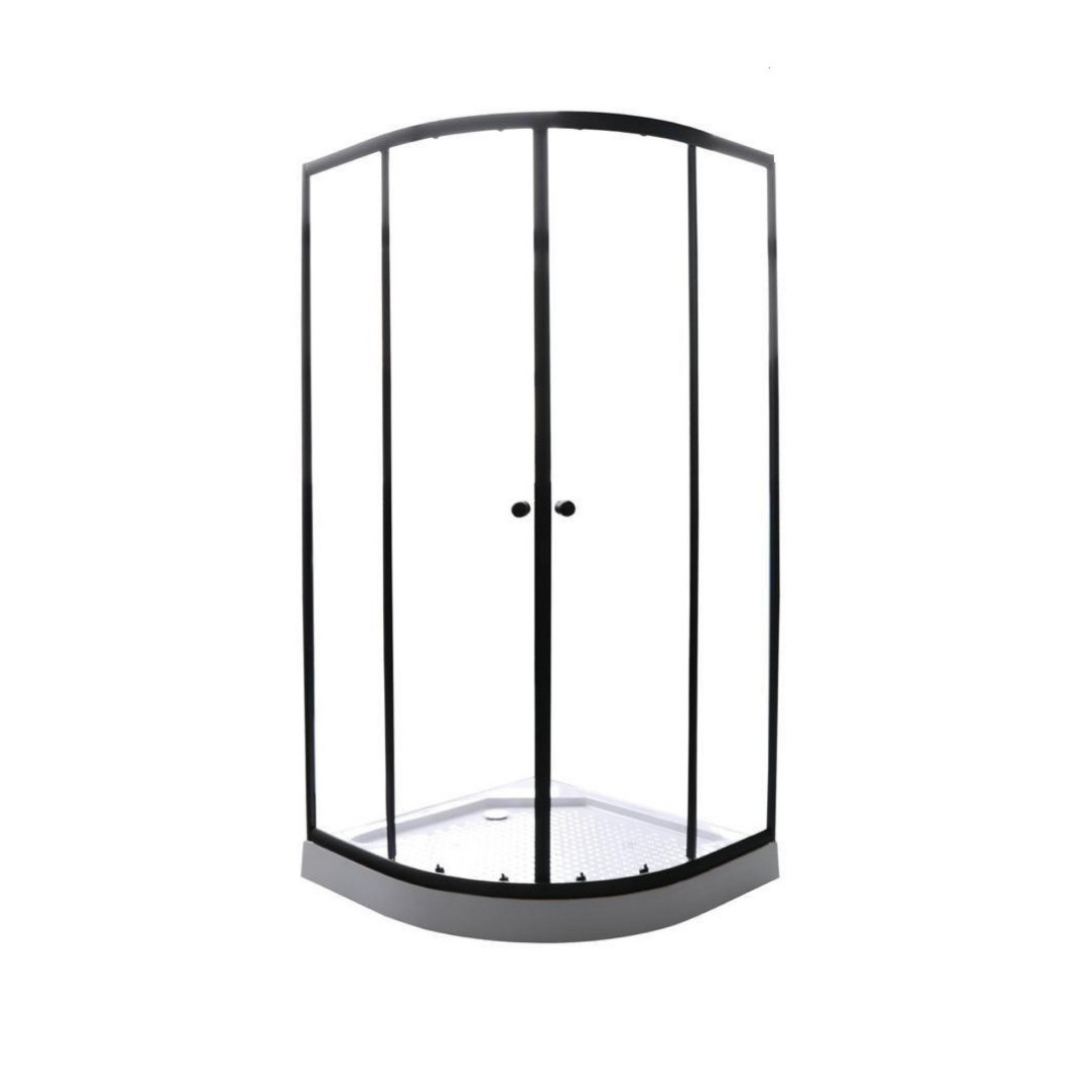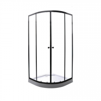 Сочетание черного профиля и прозрачного стекла отлично впишется в современную ванную комнату. Уголок полукруглой формы с раздвижными дверями экономит полезную площадь в санузле.