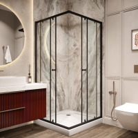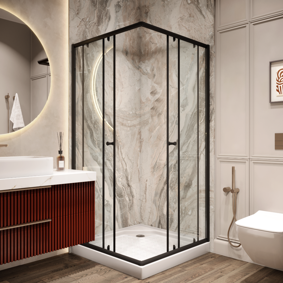 Компактная стильная модель с угловым входом. Прямые черные линии в сочетании с прозрачным стеклом подчеркивают современный дизайн. Раздвижные двери на одинарных роликах ходят плавно, не соскакивают с направляющих.