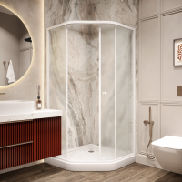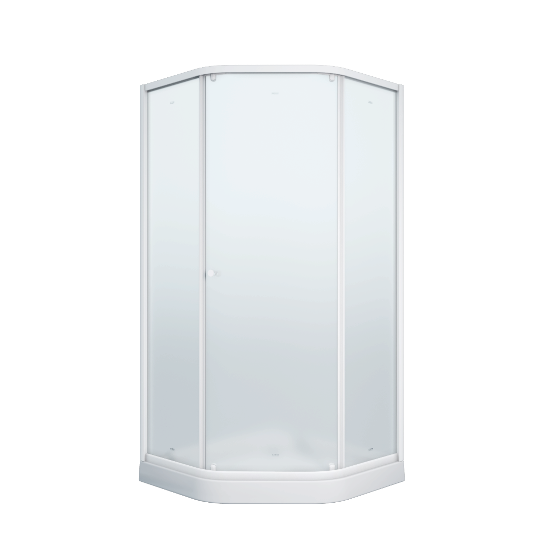 Уголок из матового стекла и белого алюминиевого профиля лаконично впишется практически в любое оформление ванной комнаты. Трапециевидная форма и раздвижные двери экономят полезную площадь в санузле Модель практична. На матовом стекле не видны разводы от воды, полотно легко чистить.