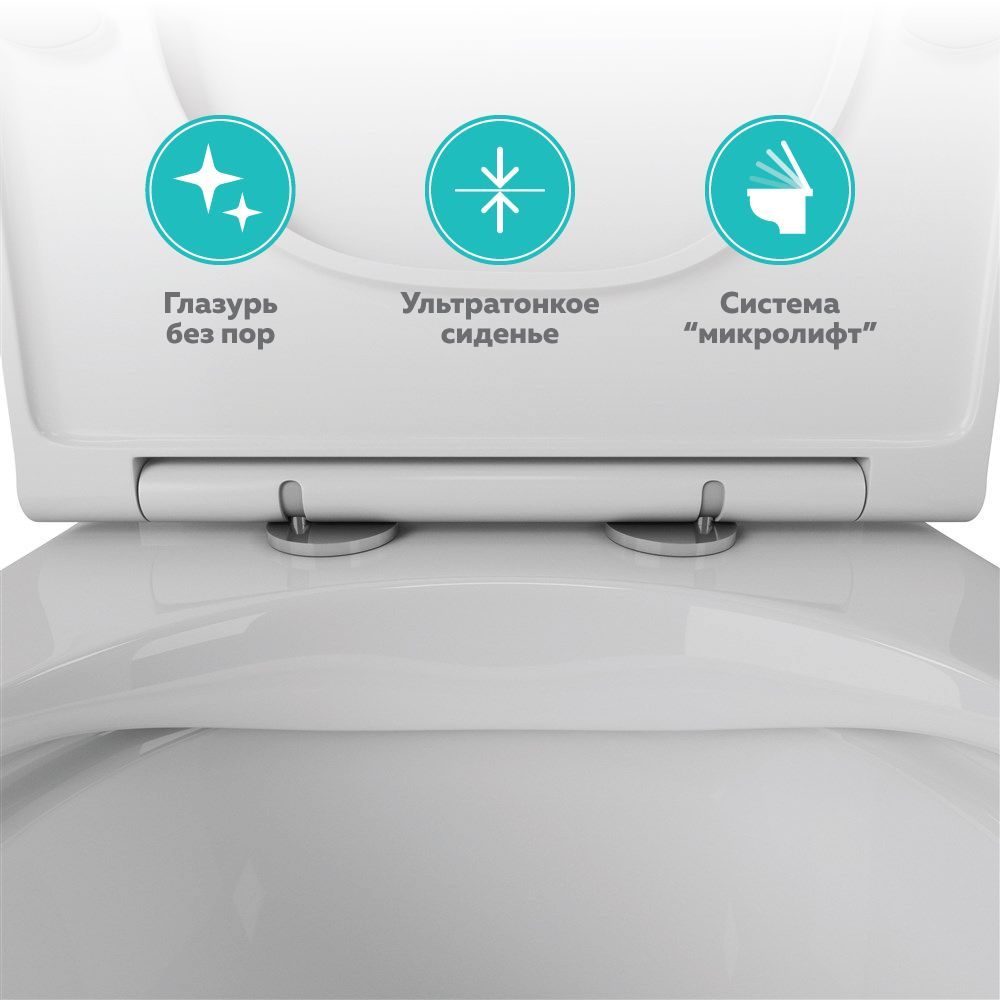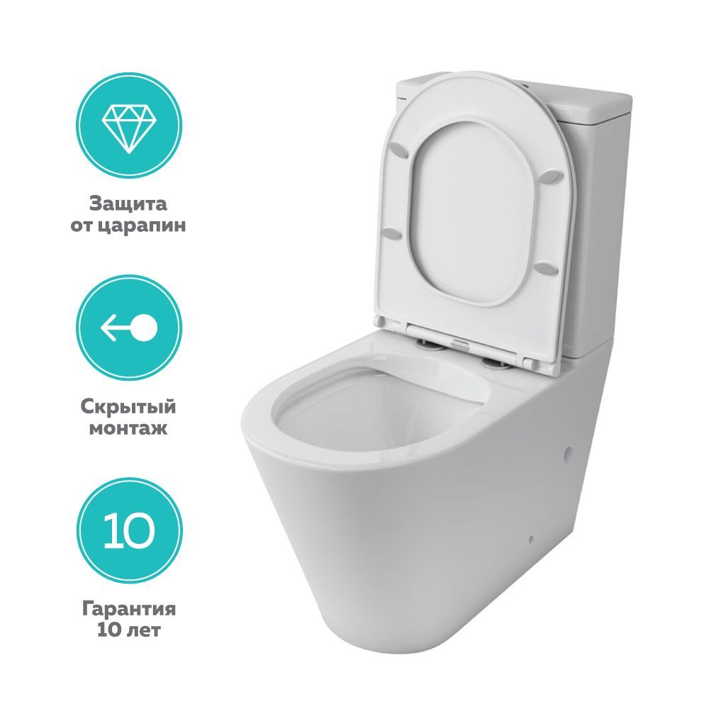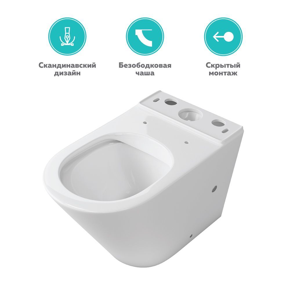 Безободковый (Rimless) унитаз-компакт. Надёжная водосливная арматура WDI. Глазурь полностью закрывающая поры в керамике позволяет сделать процесс очистки изделия проще, а также препятствует образованию налёта. Антибактериальное покрытие препятствующее размножению микроогранизмов. Универсальный выпуск. Мощный вихревой слив (Технология Orkan). Универсальный подвод воды, в том числе, скрытый. Быстросъемное сиденье, дюропласт, крышка микролифт. Кнопка смыва на 3\6 литров.