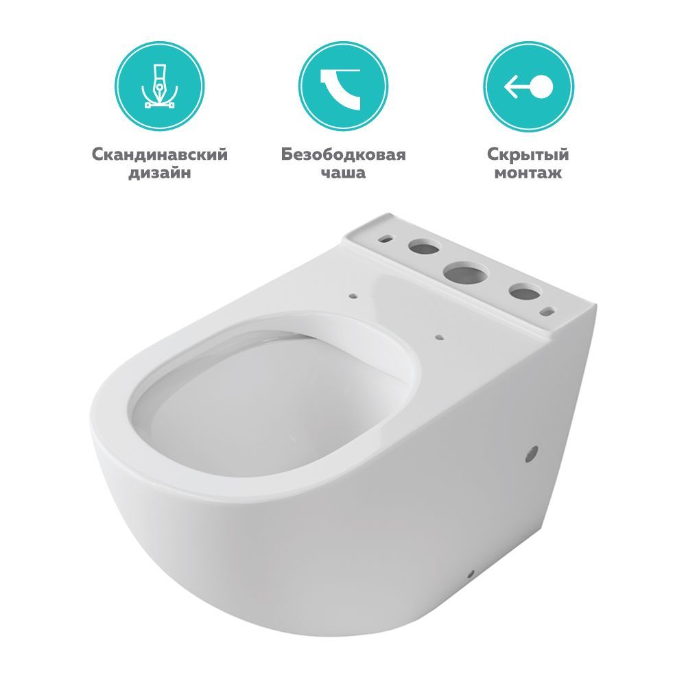 Безободковый (Rimless) унитаз-компакт. Надёжная водосливная арматура WDI. Глазурь полностью закрывающая поры в керамике позволяет сделать процесс очистки изделия проще, а также препятствует образованию налёта. Антибактериальное покрытие препятствующее размножению микроогранизмов. Универсальный выпуск. Мощный вихревой слив (Технология Orkan). Универсальный подвод воды, в том числе, скрытый. Быстросъемное сиденье, дюропласт, крышка микролифт. Кнопка смыва на 3\6 литров.
