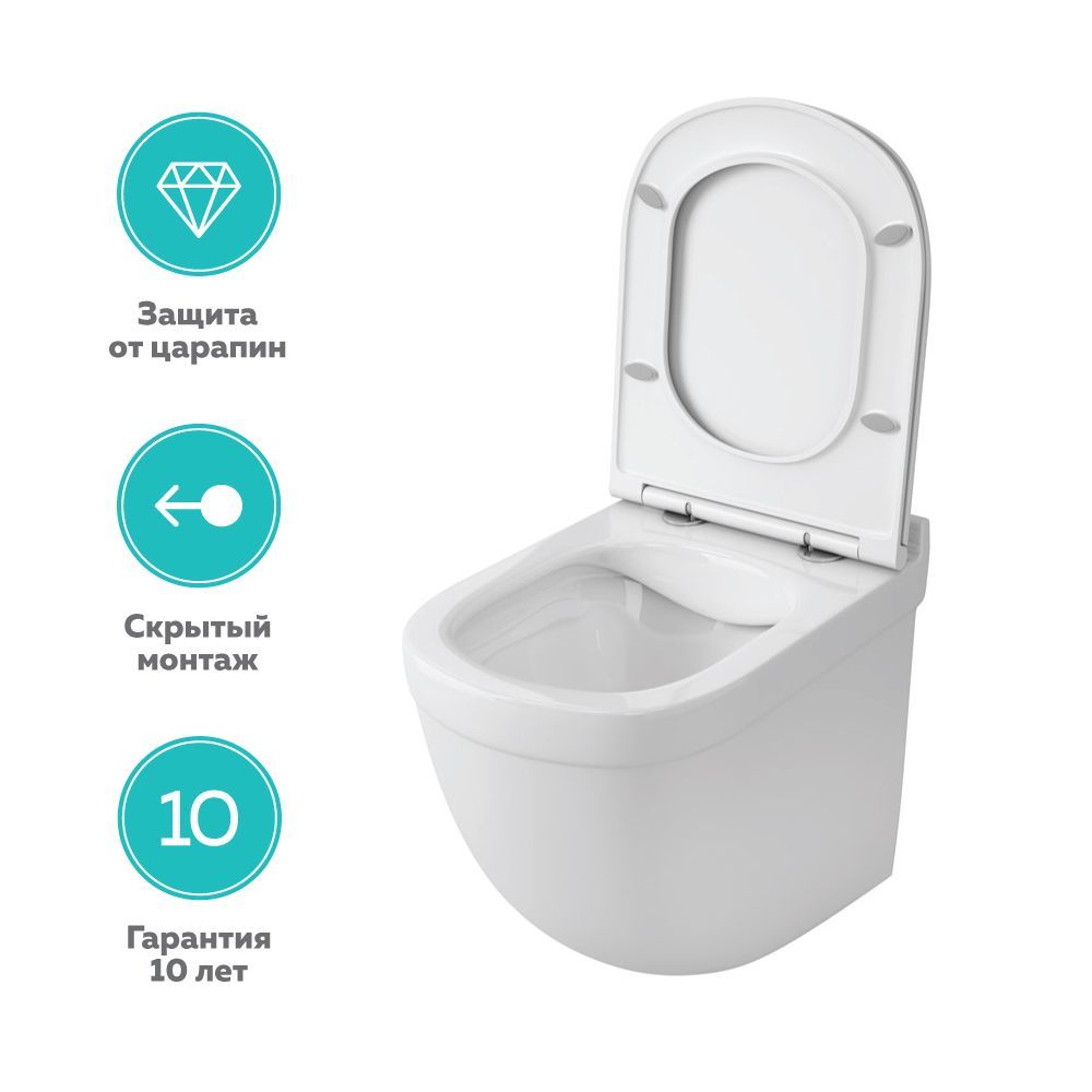 Безободковый (Rimless) подвесной унитаз. Глазурь полностью закрывающая поры в керамике позволяет сделать процесс очистки изделия проще, а также препятствует образованию налёта. Антибактериальное покрытие препятствующее размножению микроогранизмов. Горизонтальный выпуск. Мощный вихревой слив (Технология Orkan). Быстросъемное сиденье, дюропласт, крышка микролифт.