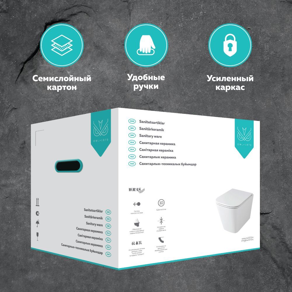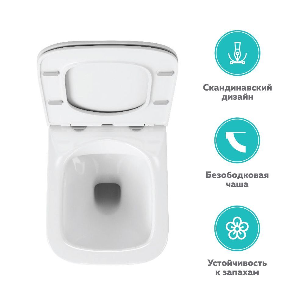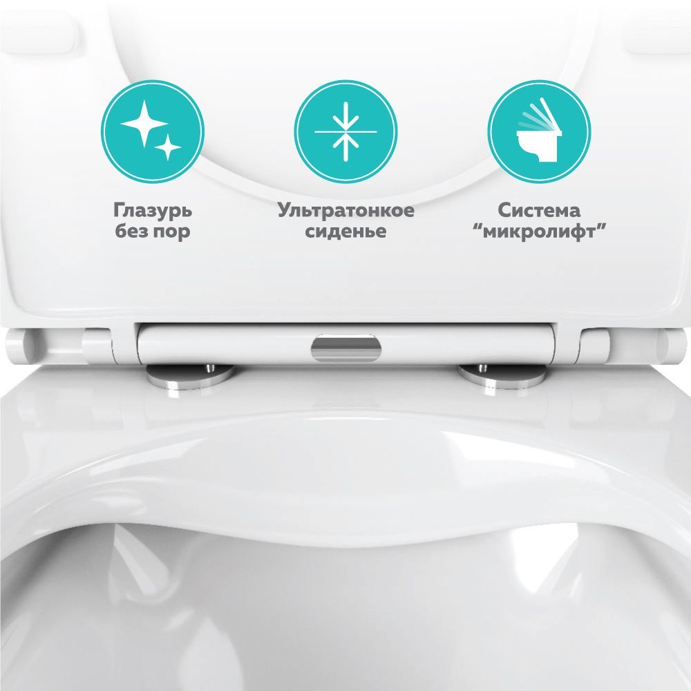 Безободковый (Rimless) подвесной унитаз. Глазурь полностью закрывающая поры в керамике позволяет сделать процесс очистки изделия проще, а также препятствует образованию налёта. Антибактериальное покрытие препятствующее размножению микроогранизмов. Горизонтальный выпуск. Мощный вихревой слив (Технология Orkan). Быстросъемное сиденье, дюропласт, крышка микролифт.