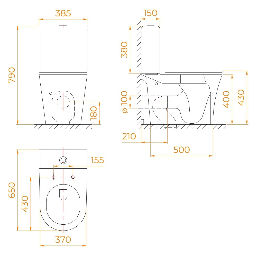 Универсальный выпуск сливаУнитаз имеет короткий выпуск слива и совместим со всеми системами отвода. Используя необходимый тип патрубка (гофры), его можно присоединить к канализации с горизонтальным, косым и вертикальным канализационным стоком.