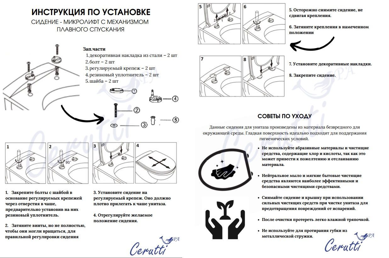 В комплекте присутствует легкосъемное сидение с крышкой, оснащенное системой микролифт (для плавного и бесшумного опускания). Крепления к чаше выполнены из стали, а само сидение - из долговечного полимерного материала – дюропласта с антибактериальным покрытием. Снятие осуществляется одним нажатием кнопки.