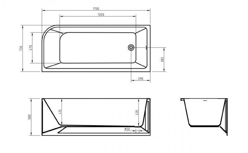 Ванны без декоративной накладки на переливное отверстие, донный клапан в цвете хром