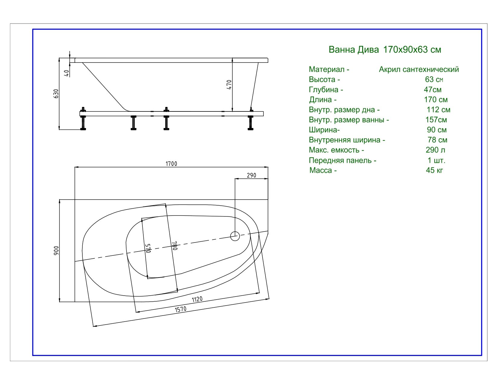 • ванна акриловая • каркас (или универсальная опора), слив-перелив, фронтальный и боковой экраны в комплект не входят и поставляются отдельно • установка гидромассажного оборудования не предусмотрена |