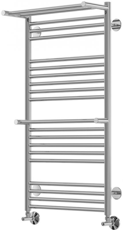Водяной полотенцесушитель Terminus Аврора П20 500х1010 4660059582160 с полкой, с нижним подключением. Для производства полотенцесушителя используется только высококачественная нержавеющая сталь марки AISI 304L с высоким содержанием легирующих элементов, Ni и Cr, это позволяет изделиям сохранять стойкость к агрессивным коррозийным средам, что существенно продлевает срок их эксплуатации. Толщина стенки используемой трубы не менее 2 мм, это обеспечивает 10-ти кратный запас прочности, труба устойчива к резким перепадам давления в системе водоснабжения!