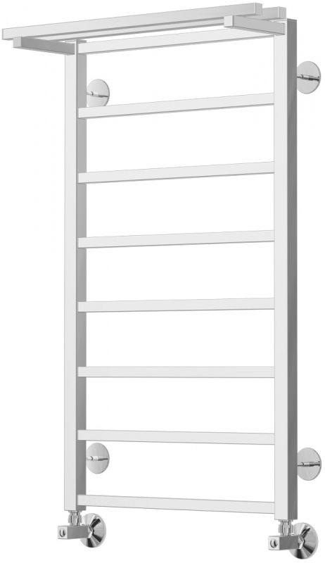 Водяной полотенцесушитель Terminus Контур П8 500х900 4660059582498 с полкой, с нижним подключением. Для производства полотенцесушителя используется только высококачественная нержавеющая сталь марки AISI 304L с высоким содержанием легирующих элементов, Ni и Cr, это позволяет изделиям сохранять стойкость к агрессивным коррозийным средам, что существенно продлевает срок их эксплуатации. Толщина стенки используемой трубы не менее 2 мм, это обеспечивает 10-ти кратный запас прочности, труба устойчива к резким перепадам давления в системе водоснабжения!