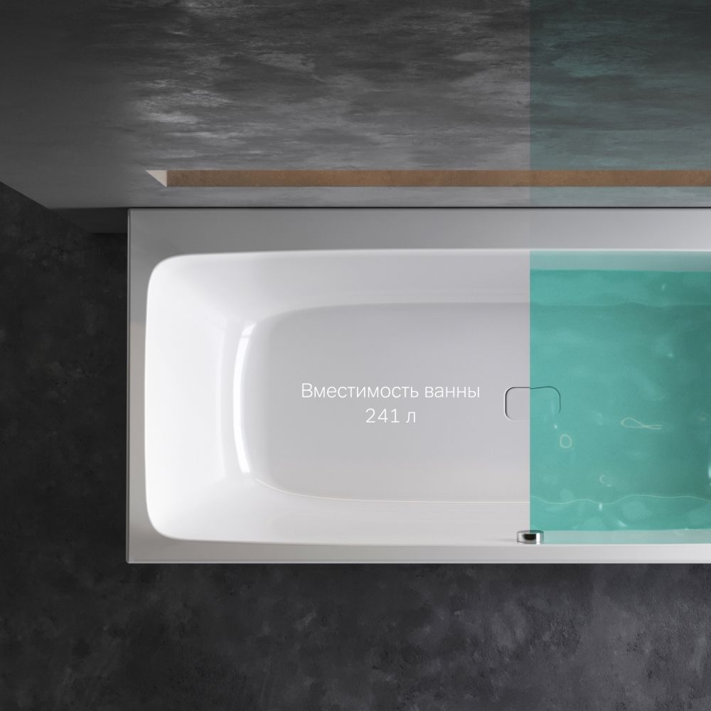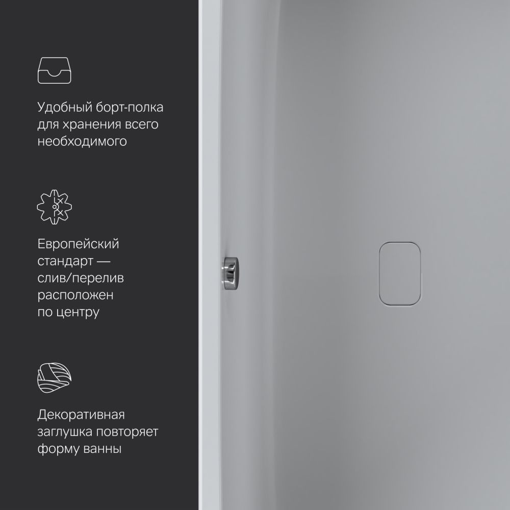Характерный дизайн: сочетание широкого борта с одной стороны с ультра-тонким бортом с другой стороны создает неповторимую квинтэссенцию стиля. А декоративная заглушка слива повторяющая форму самой ванны станет яркой деталью в интерьере.