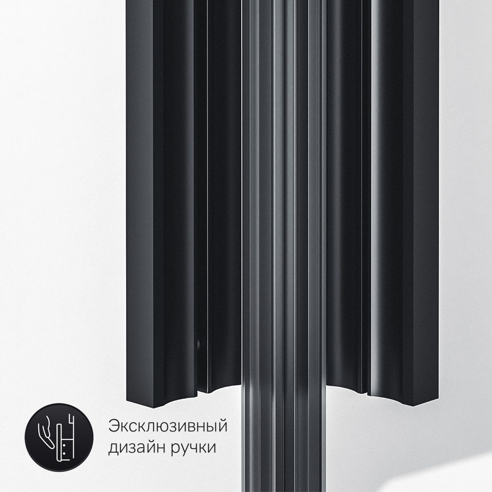 Идеальное сочетание профилей массивный горизонтальный и узкие вертикальные. Надежная фурнитура в цвет профиля – тотально черный даже в деталях