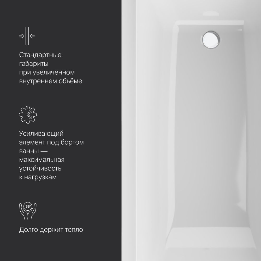 Удобная спинка и оптимальные размеры ванной гарантируют полное расслабление и хороший отдых. За счет низкой теплопроводности и теплоемкости акрила ванна поддерживает температуру набранной воды.