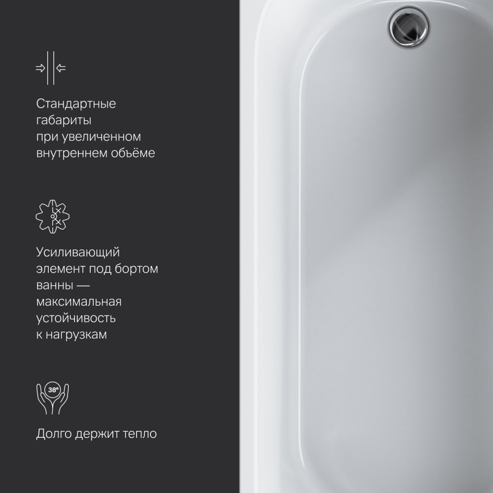 Увеличенный внутренний объем при стандартных внешних габаритах благодаря ультратонким бортам делает процесс принятия ванны комфортным для человека любой комплекции. А универсальный дизайн подойдет как для современного так и для классического интерьера.