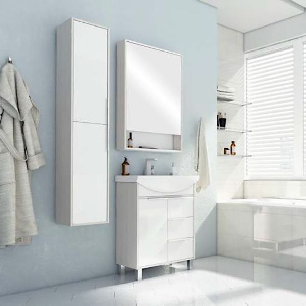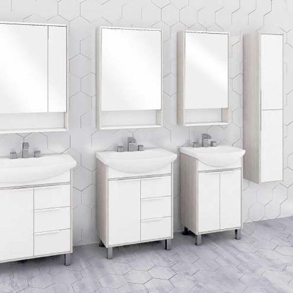 Белоснежный цвет фасадов в сочетании со вставками и боковыми стенками Ясень фабрик придадут вашей ванной комнате ощущения свежести и уюта. Благодаря лаконичным белым ручкам на тумбе и отсутствию лицевой фурнитуры на шкафчике коллекция универсальна, впишется в любую ванную комнату.