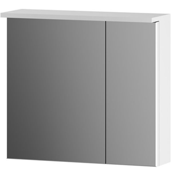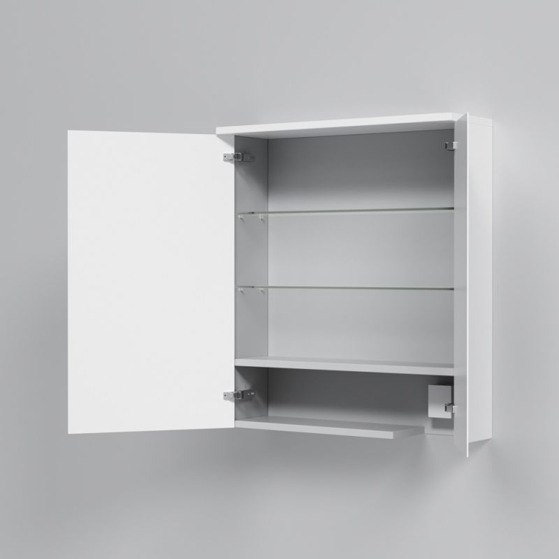 Зеркальный шкаф AM.PM Spirit 60 M70MCX0601WG с двумя распашными дверцами и двумя полками за ними, с подсветкой сверху, с выключателем и розеткой. Для использования в ванных комнатах с повышенной влажностью.