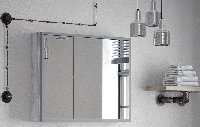 Коллекция выполнена в актуальном стиле "Лофт". Зеркало-шкаф закреплено на металлическом каркасе. У зеркало-шкафа 3 двери, в которых используются специальные толкатели, чтобы мягко открывать закрывать их. Позади дверей - полки.