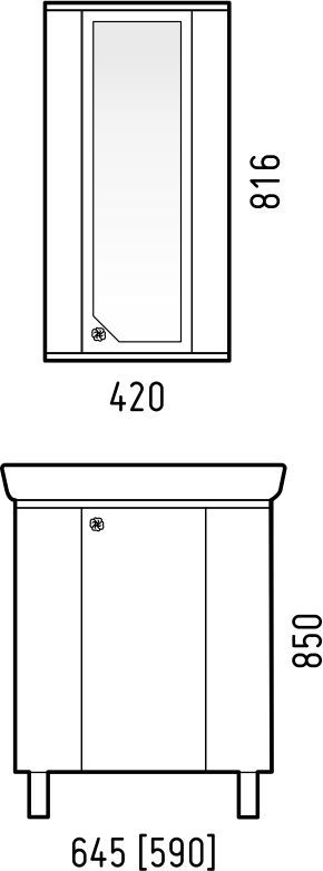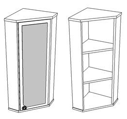 Шкаф угловой, имеет 1 распашную дверь. Позади двери - 2 полки. На дверь наклеено зеркало. Боковины, дверь, верхняя и нижняя крышки - МДФ.