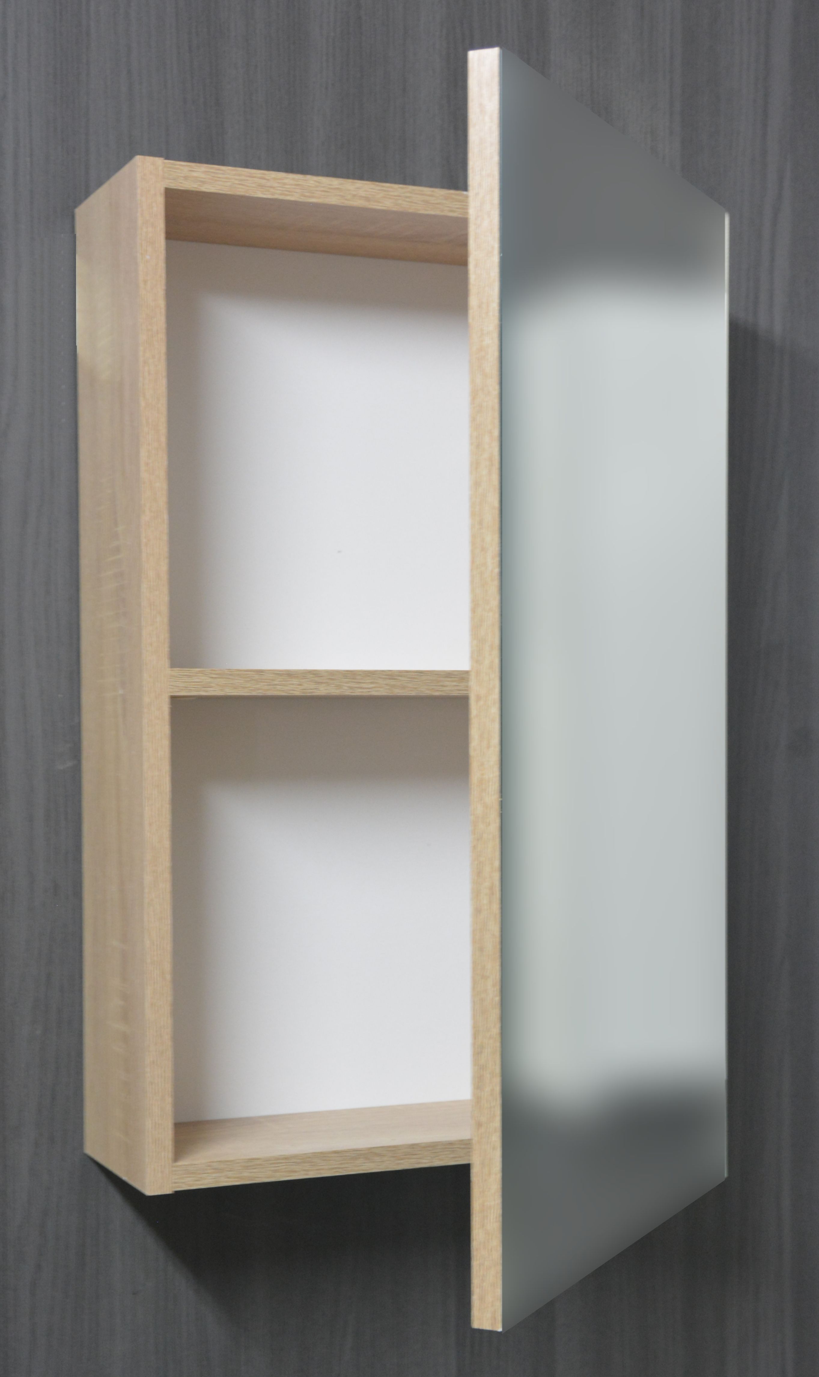 Зеркало-шкаф представляет собой шкаф с дверцей, на которую наклеено зеркало. Позади двери 2 полки. Петли на двери с доводчиками. Зеркало и дверь имеют свис снизу на 19,5 мм, за который дверь можно открыть.