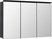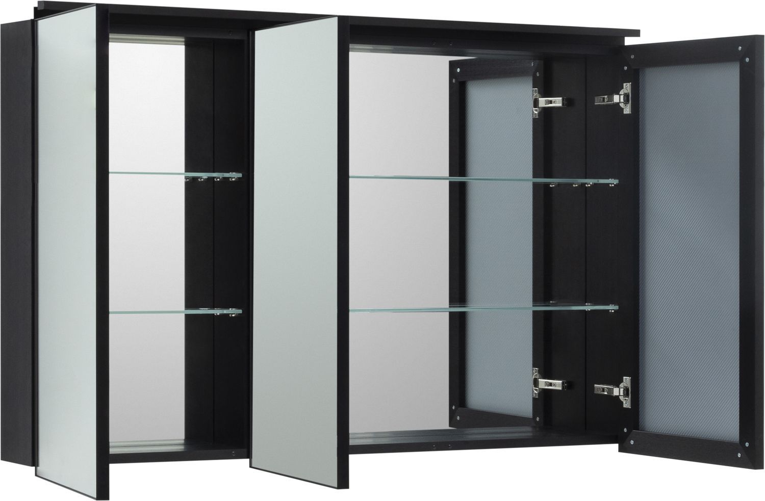 Распашные дверцы оснащаются доводчиками для плавного и бесшумного закрывания. За ними располагаются четыре стеклянные полки, подходящие для хранения гигиенических средств и косметики. Для ухода за зеркальной поверхностью рекомендуется применять специальные составы без абразивных частиц и мягкую ветошь. Модель подвесная и крепится к стене. Габариты — 1200х140х765 мм.