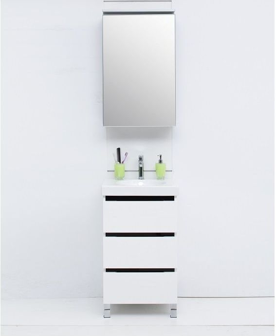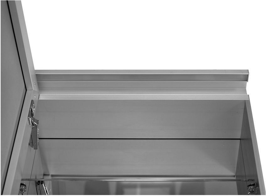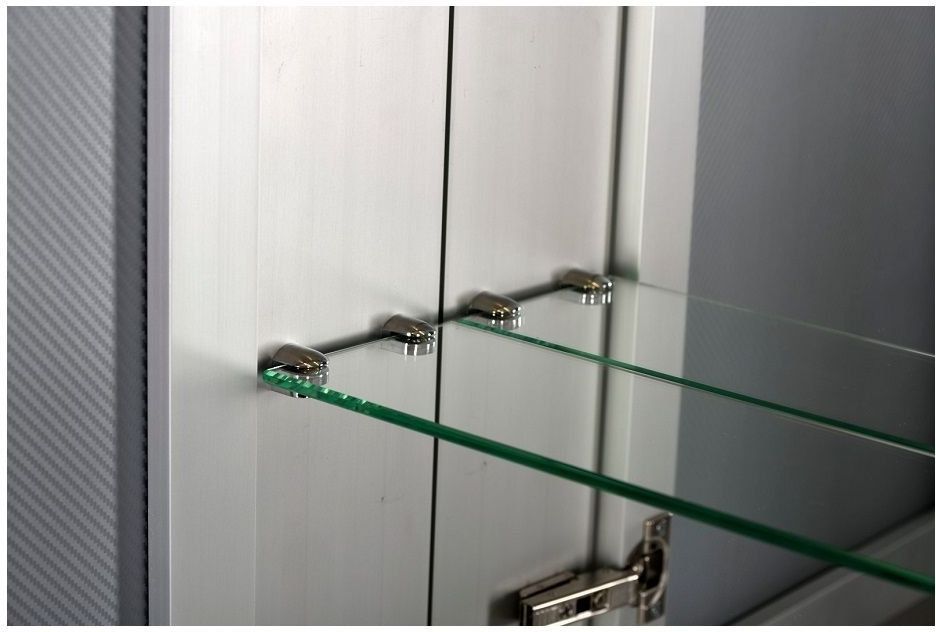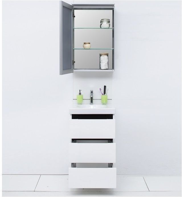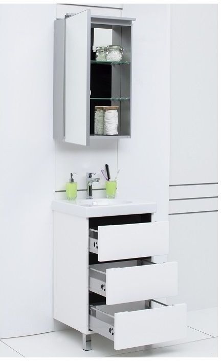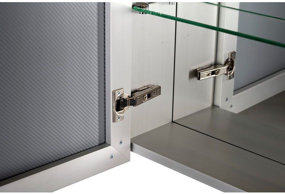 Зеркало-шкаф De Aqua 50 (серебро) в алюминиевом корпусе содержит большую зону хранения за распашной дверцей. Ширина - 50 см, полочки внутри сделаны из стекла.