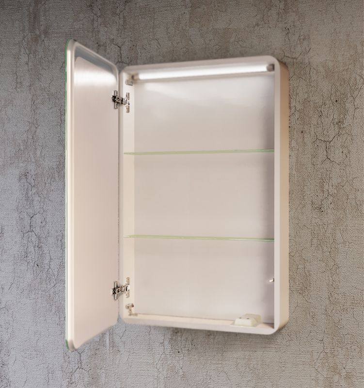 Подвесной зеркальный шкаф Raval Pure 60 Pur.03.60/W с гладкими формами, с распашной дверцей, внутренними полками, с подсветкой и розеткой. Предназначен для использования в ванных комнатах с повышенной влажностью. Влагостойкие и экологичные материалы, качественная работа фурнитуры, ударопрочность, приятные тактильные ощущения.