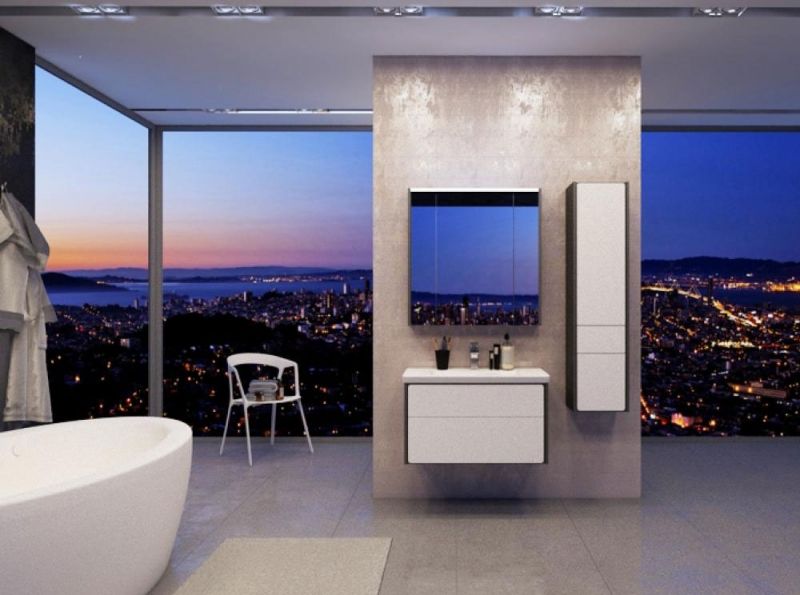 - оснащение: зеркало с светодиодной подсветкой, розеткой IP - 44, сенсорным выключателем с возможностью регулировки яркости, полки, крепления.