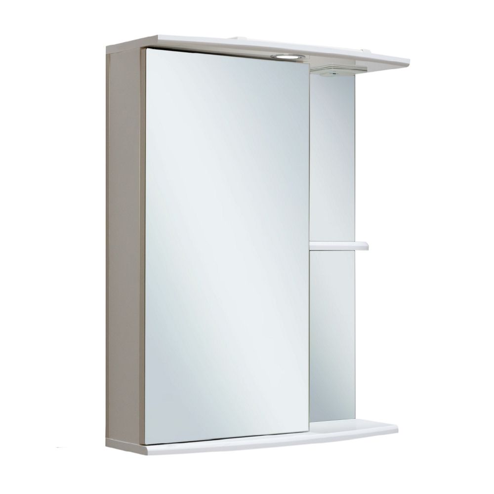 Зеркальный шкаф оборудован одним врезным светодиодным светильником 220В и розеткой с выключателем. Слева - шкаф с зеркальной дверцей и двумя внутренними полками, справа - открытая полочка. Петли со встроенным доводчиком. Выпускается только в левом исполнении.