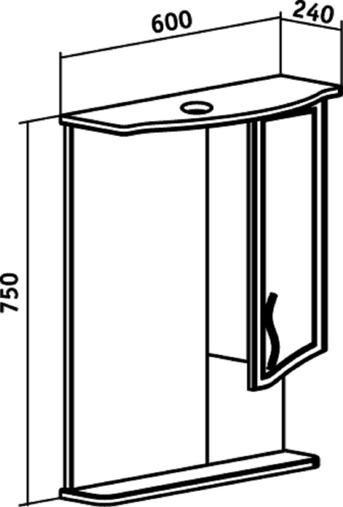 Зеркальный шкаф оборудован одним врезным светодиодным светильником 220В и розеткой с выключателем. . Справа - шкафчик с распашным фасадом и одной внутренней полкой. Под зеркалом - нижняя полка. Петли со встроенным доводчиком, ручка - 1шт. Выпускается только в правом исполнении.