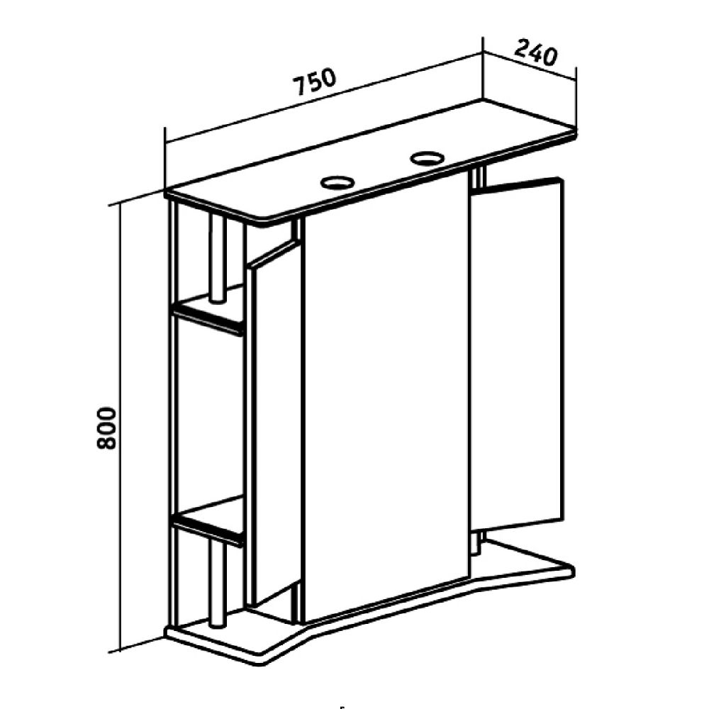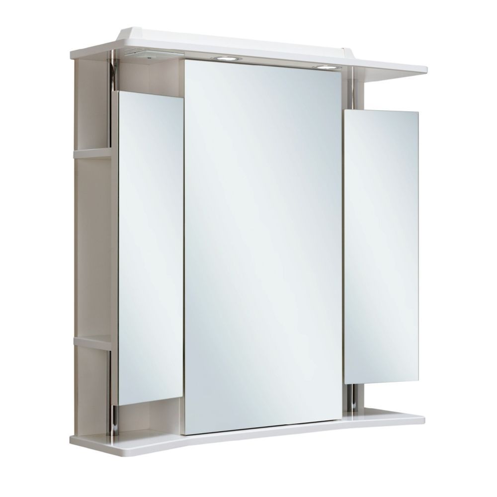 Зеркальный шкаф оборудован двумя светодиодными светильниками 220В, розеткой с выключателем. Шкаф в виде трельяжа, с тремя распашными зеркальными дверками, за каждой из которых находятся по две полки. Петли со встроенным доводчиком.