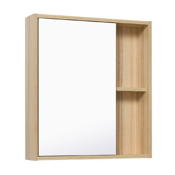 Зеркальный шкаф без подсветки с одной распашной дверкой и открытыми полками (слева или справа, зависит от установки). Внутри шкафа -одна внутрення полка. Универсальный.
