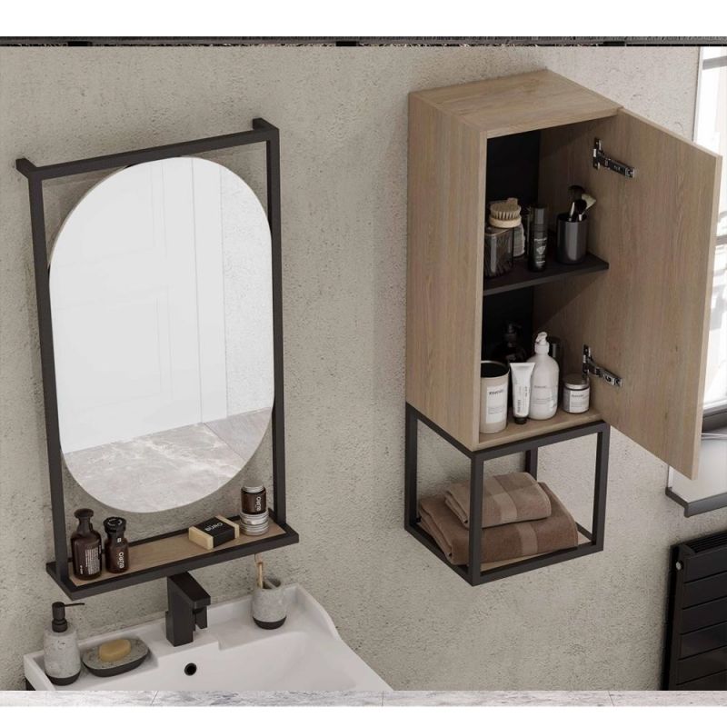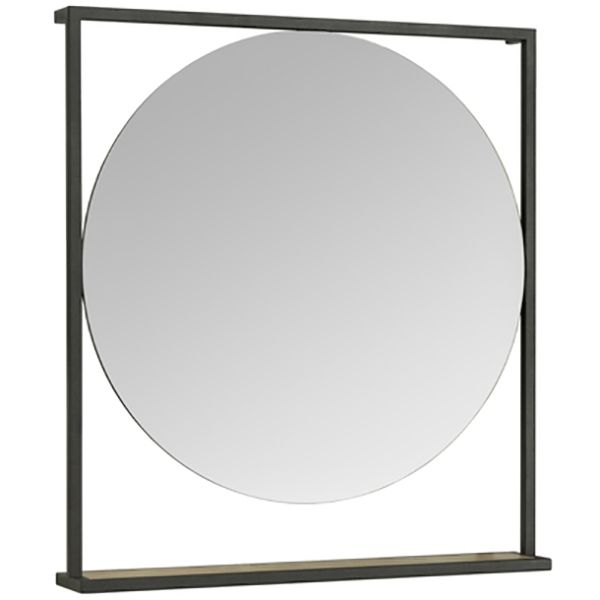 - Черные металлические профили в форме прямоугольника обрамляют овальное зеркало, под которым находится полочка из влагостойкой ламинированной плиты в цвете дуб эндгрейн.
