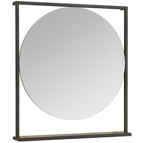- Черные металлические профили в форме прямоугольника обрамляют овальное зеркало, под которым находится полочка из влагостойкой ламинированной плиты в цвете дуб кантри.