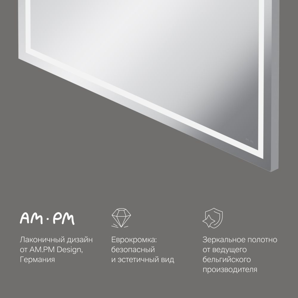 Зеркало AM.PM Gem 100 M91AMOX1001WG с подсветкой. Ультрамодный лаконичный дизайн зеркал Gem от собственной студии дизайна AM.PM Design подойдет к интерьеру любой ванной комнаты. Усиленная LED-подсветка по периметру обеспечивает отличное рассеянное освещение и отсутствие теней. Срок службы светодиодов составляет более 30 000 часов. Скрытый механический выключатель сохраняет эстетическую целостность дизайна зеркала, а также гарантирует отсутствие отпечатков пальцев на зеркальном полотне. Зеркальное полотно премиального качества производства Бельгии. Гарантия 3 года.