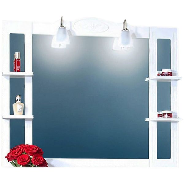 - Фигурное зеркало Бриклаер Анна 120 с четырьмя открытыми полочками, со светильниками в форме цветочков. Для использования в ванных комнатах с повышенной влажностью.
