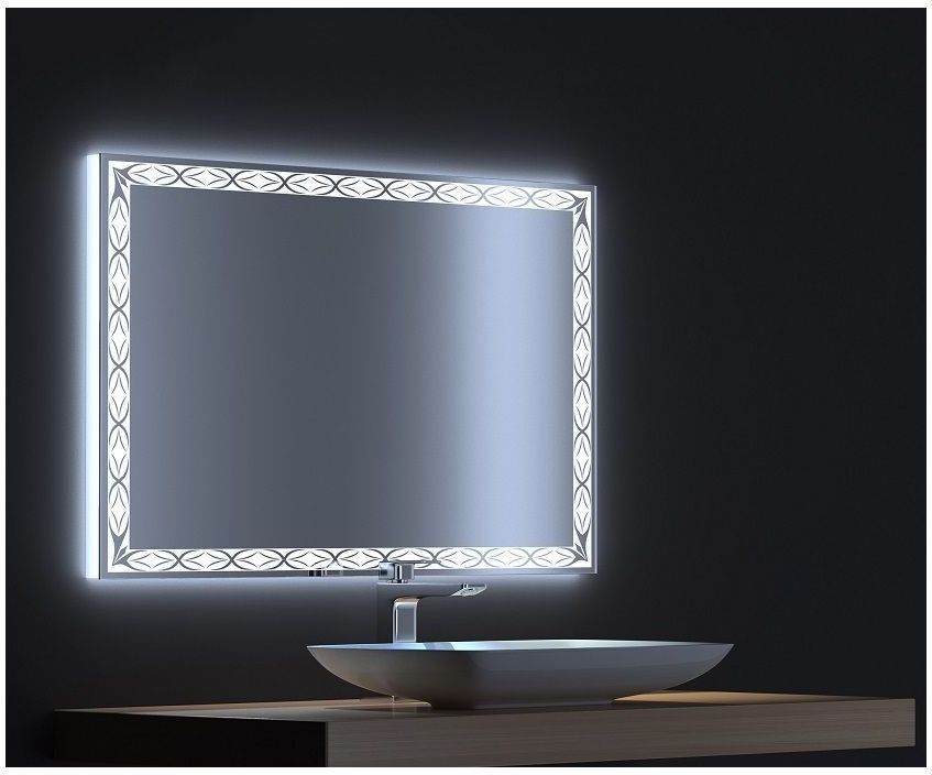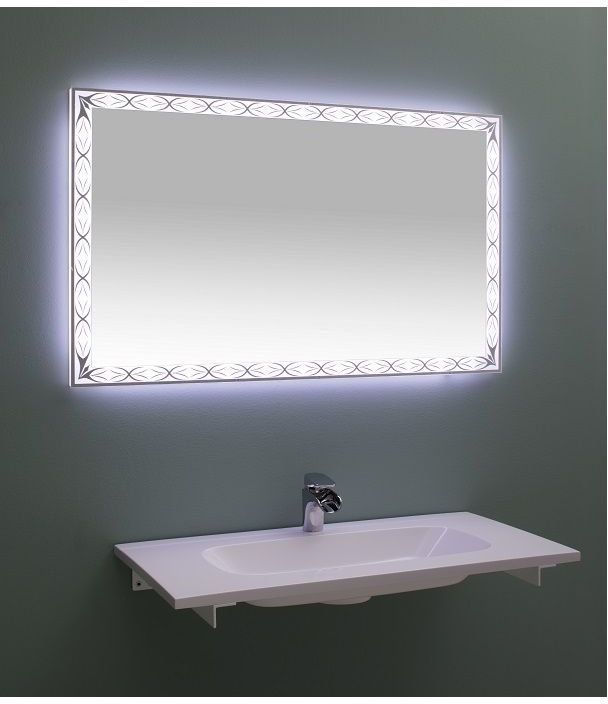Зеркало De Aqua Тренд 14075 создаст изысканность и живописность в помещении Подсветка является главным украшением зеркального полотна Сквозь витиеватый, тщательно продуманный орнамент, пущенный по периметру прямоугольного зеркального полотна, льется холодный, спокойный свет Зеркало размером 140х75 (см) предусматривает универсальный монтаж Сенсорный выключатель для удобства использования встроен прямо в раму LED-подсветка (холодный свет), сенсорный выключатель на раме, универсальный монтаж <