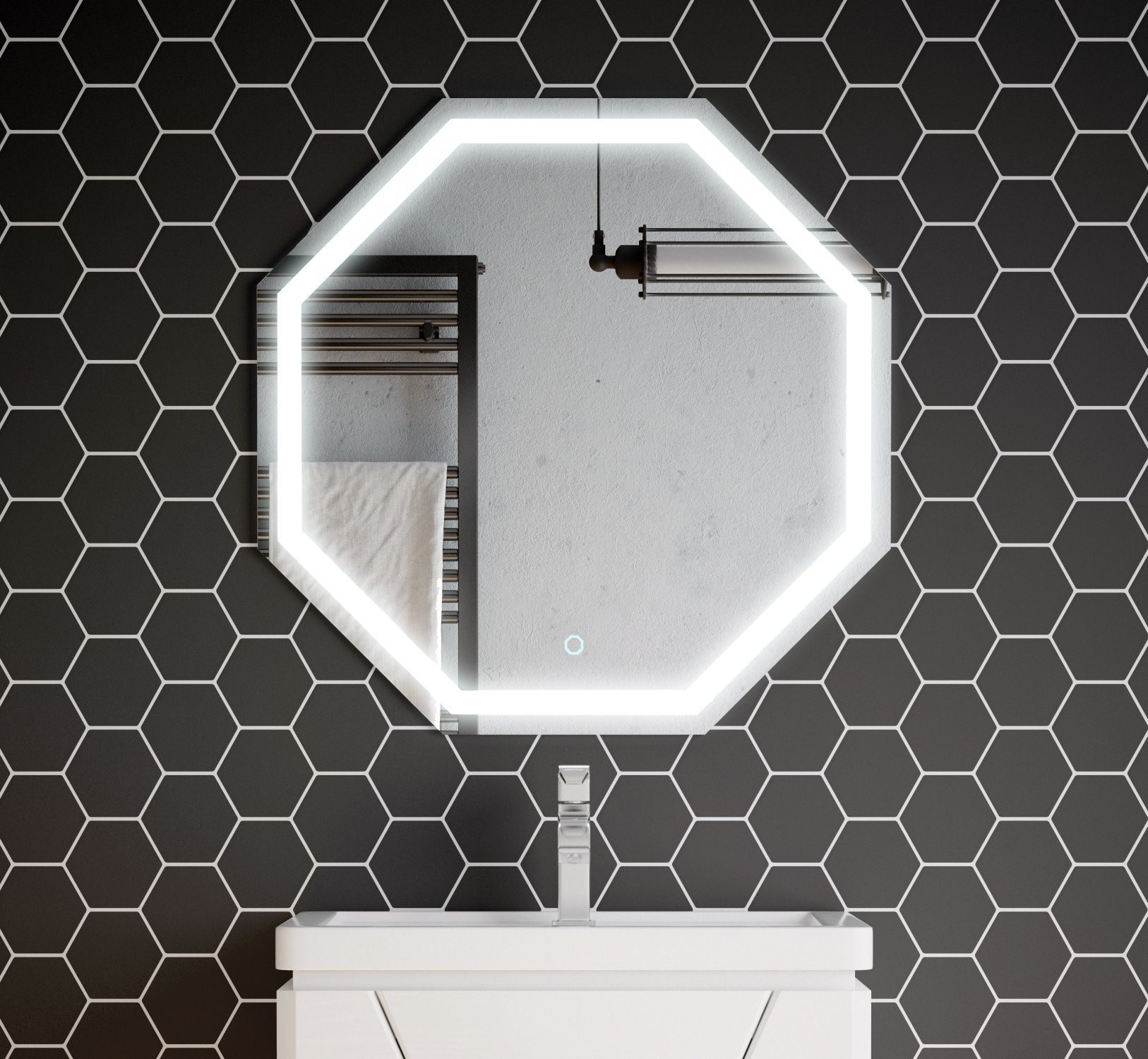 Зеркало "Каре" шириной 700 и высотой 700 мм. Правильный 8-гранник. С отступом 25 мм от края по всему периметру идёт область пескоструя шириной 25 мм. LED-подсветка, сенсорный выключатель с регулировкой яркости, то есть существует возможность регулировки освещенности (делать подсветку ярче или темнее). Класс защиты: IP67. Класс энергетической эффективности: A++. Серебряное зеркало, стекло высшего качества M1. AC/DC трансформатор.