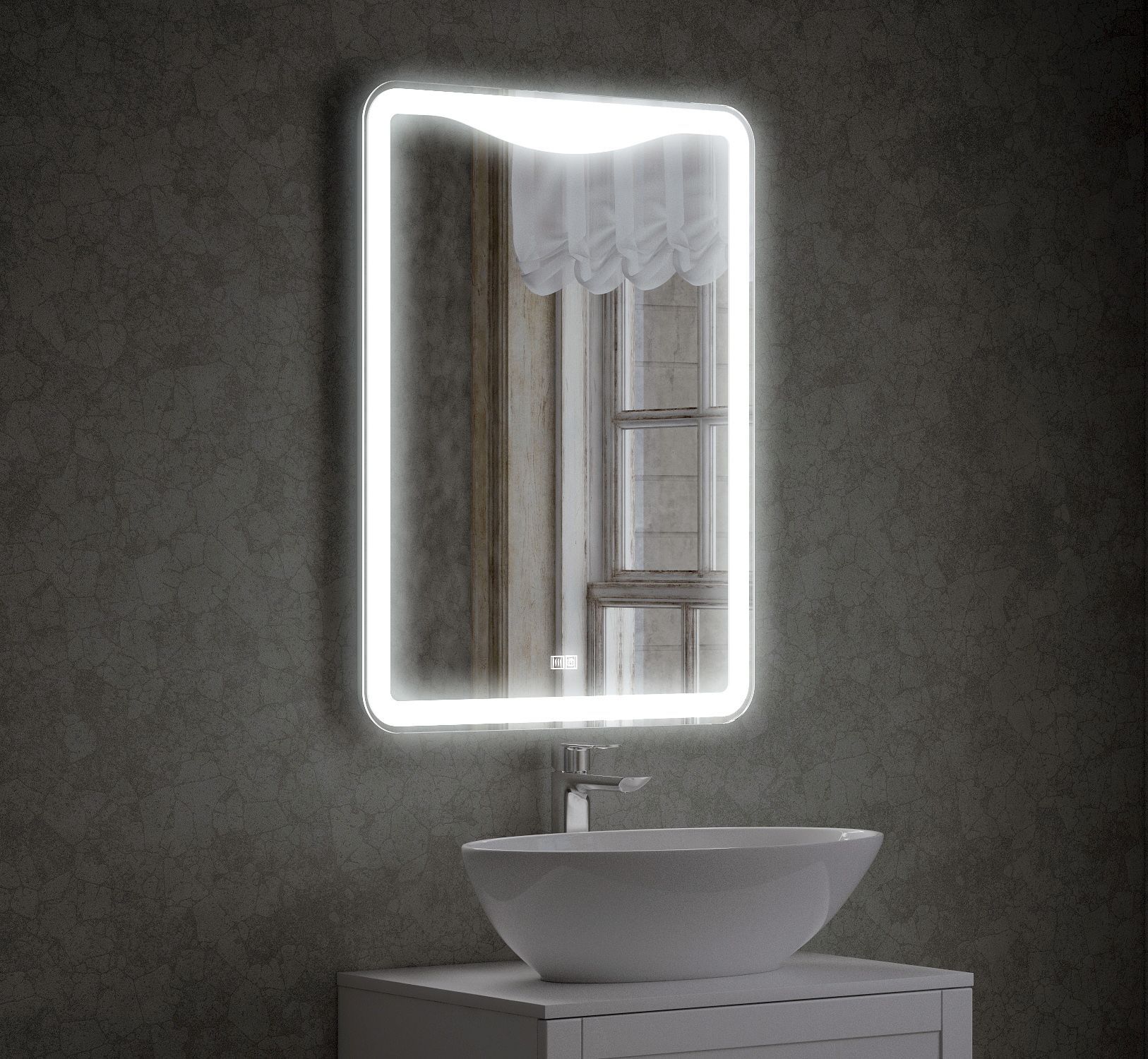 Зеркало "Орли" шириной 600 мм, высотой 800 мм. С отступом в 10 мм от края по всему периметру зеркала идёт область пескоструя шириной в 30 мм. Углы скруглены. Сверху зеркала - пескоструй в форме "чёлочки". Подсветка этой области осуществляется при помощи нажатия кнопки. Существует возможность регулировки освещенности (делать подсветку ярче или темнее). LED-подсветка, сенсорный выключатель с регулировкой яркости. Класс защиты: IP67. Класс энергетической эффективности: A++. Серебряное зеркало, стекло высшего качества M1. AC/DC трансформатор. Опция антизапотевания.
