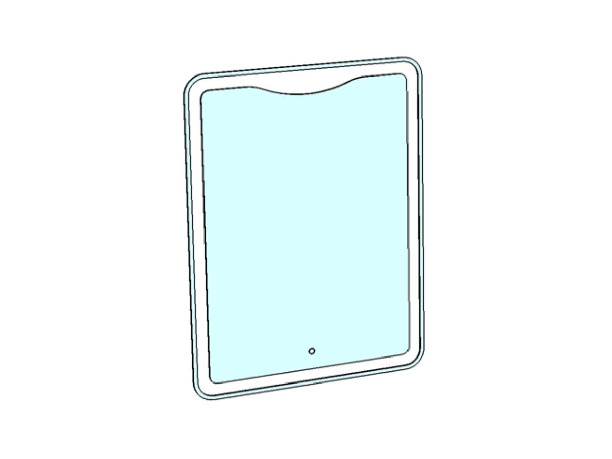 Зеркало "Орли" шириной 600 мм, высотой 800 мм. С отступом в 10 мм от края по всему периметру зеркала идёт область пескоструя шириной в 30 мм. Углы скруглены. Сверху зеркала - пескоструй в форме "чёлочки". Подсветка этой области осуществляется при помощи нажатия кнопки. Существует возможность регулировки освещенности (делать подсветку ярче или темнее). LED-подсветка, сенсорный выключатель с регулировкой яркости. Класс защиты: IP67. Класс энергетической эффективности: A++. Серебряное зеркало, стекло высшего качества M1. AC/DC трансформатор.
