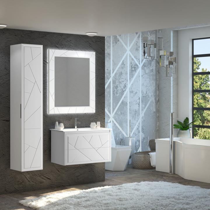 Коллекцию ЛУИДЖИ украшают сложная фрезеровка фасадов строгими линиями и декоративная подсветка по периметру зеркала, которое оснащено сенсорным выключателем. Тумбы дополняются современными ультратонкими керамическими слим-раковинами в размерах 70 см и 90 см.